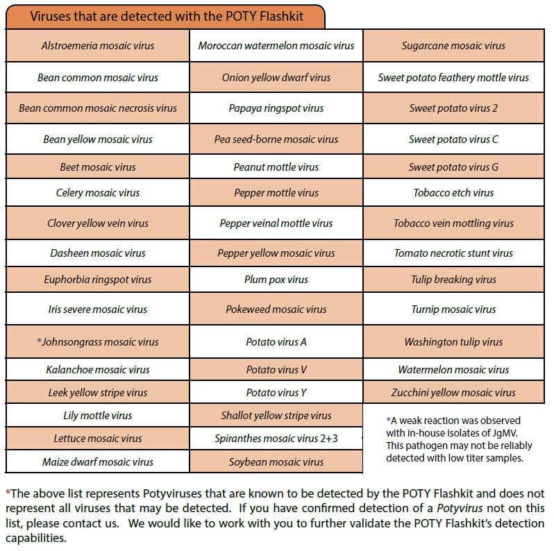 OTY Flashkit can quickly identify more than 40 members of the Potyvirus genus and can be used to test more than 55 different crops. The test can be used in the field or in the lab and requires no experience to perform. Results are available in as little as 5 minutes with a maximum run time of 30 minutes. The list represents Potyviruses that are known to be detected by the POTY Flashkit and does not represent all viruses that may be detected. If you have confirmed detection of a Potyvirus not on this list, please contact us. We would like to work with you to further validate the POTY Flashkit’s detection capabilities. Detection or coating Antibody SRA (DAS-ELISA) Conjugate Antibody SRA (DAS-ELISA)